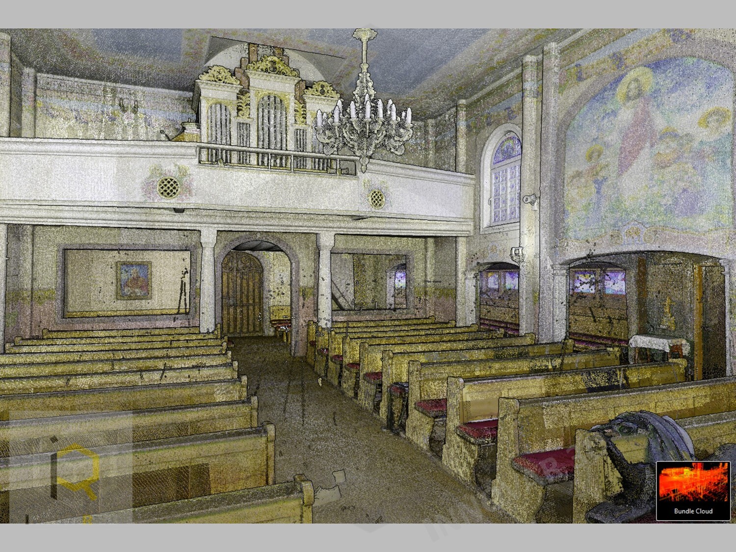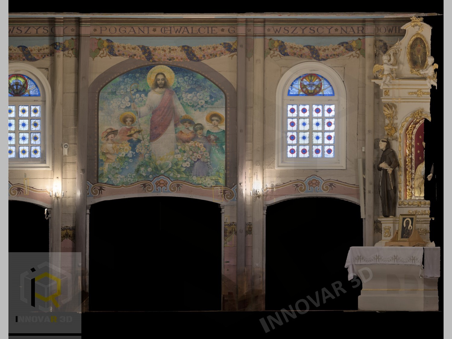 Głównym celem realizacji była digitalizacja malowideł ściennych znajdujących się wewnątrz kościoła – szczególnie tych znajdujących się w prezbiterium i na suficie nawy głównej. W tym celu, oprócz skanowania laserowego, wykonano ortofotoplany, czyli geometrycznie skalibrowane obrazy o bardzo wysokiej rozdzielczości. Ortofotoplan to połączenie fotografii i geometrii – każde zdjęcie jest dokładnie odwzorowane względem powierzchni, co pozwala analizować malowidła z niezwykłą precyzją, zarówno pod względem kolorystyki, jak i deformacji czy zniszczeń.