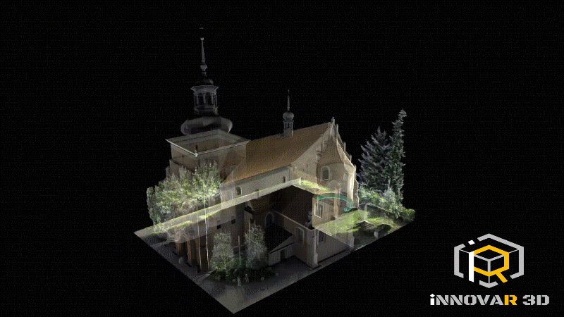 Proces zaczyna się od precyzyjnego skanowania 3D przy użyciu skanera laserowego. W ten sposób powstaje gęsta chmura punktów, która odwzorowuje każdy detal architektoniczny – od wieży, przez dach, aż po detale portali wejściowych. Następnie dane te przenosimy do środowiska Revit, gdzie tworzymy model BIM: