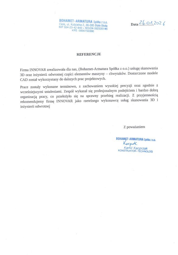 Prace zostały wykonane terminowo, z zachowaniem wysokiej precyzji oraz zgodnie z wcześniejszymi ustaleniami. Zespół wykazał się profesjonalnym podejściem i bardzo dobrą organizacją pracy, co przełożyło się na sprawny przebieg realizacji. Z przyjemnością rekomenduję firmę INNOVAR jako rzetelnego wykonawcę usług skanowania 3D i opracowań inżynierskich.