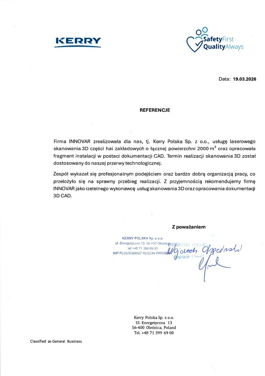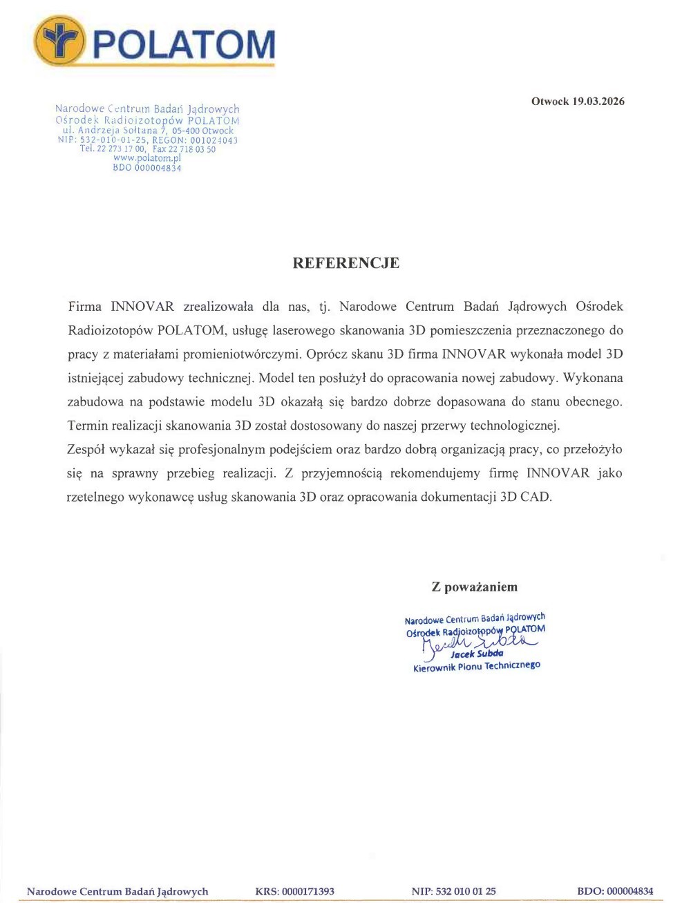 Z pełnym przekonaniem rekomendujemy firmę INNOVAR jako rzetelnego i godnego zaufania wykonawcę usług laserowego skanowania 3D.
