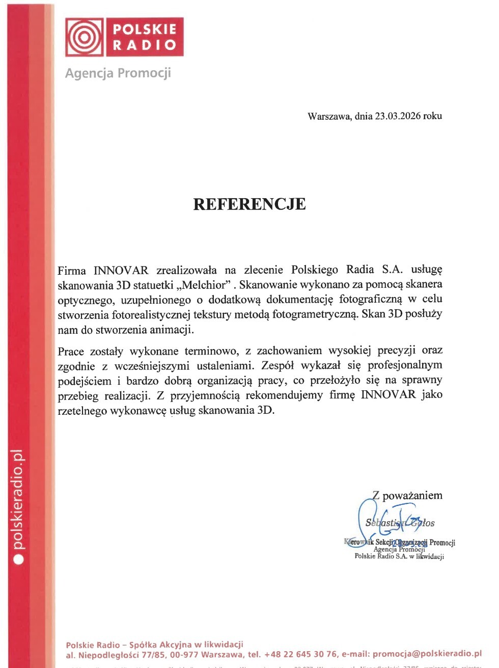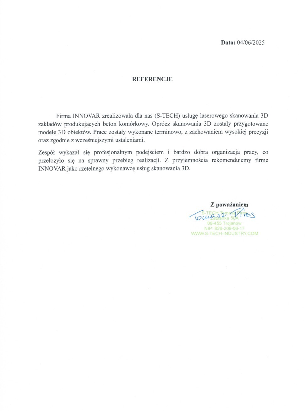 Prace zostały wykonane terminowo, z zachowaniem wysokiej precyzji oraz zgodnie z wcześniejszymi ustaleniami. Zespół wykazał się profesjonalnym podejściem i bardzo dobrą organizacją pracy, co przełożyło się na sprawny przebieg realizacji. Z przyjemnością rekomendujemy firmę INNOVAR jako rzetelnego wykonawcę usług skanowania 3D.